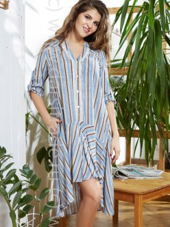 Туника домашняя женская Миа-Миа рубашечного кроя, выполнена из принтованной визкозы. Модель расклешенного силуэта с юбкой асимметричной длины. Платье с фигурным вырезом горловины и планкой-застежкой на пуговицах, декорированных кружевом. Кокетка на спине и на полочках оторочена кружевом.