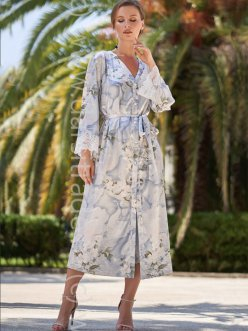Элегантный длинный халат на пуговицах и с V-образным вырезом из смесового шелкового полотна с изящным принтом. Низ рукавов 3/4 декорирован широкой полосой кружева. Линию борта украшает тонкий кант. Халат на запахе с поясом, в боковых швах есть карманы.