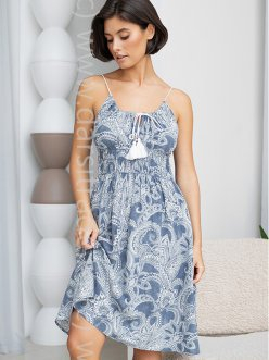Сарафан средней длины Mia-Amore на тонких бретелях. Выполнен из тканой принтованной вискозы. По вырезу полочки и спинки расположена кулиса, за счет которой можно регулировать длину бретелей.