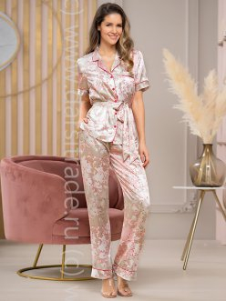 Элегантный брючный комплект Mia-Amore. Жакет с коротким рукавом и брюки выполнены из принтованного искусственного шелка с блеском и дополнены контрастными кантами. По бокам брюк расположены карманы. Линию талии можно подчеркнуть за счет пояса.