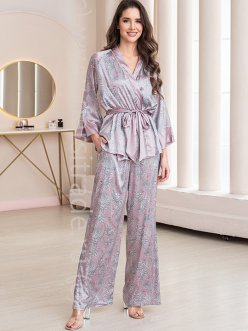 Комплект-тройка Mia-Amore состоит из запашного жакета, широких брюк и топа. Брюки и жакет выполнены из принтованного смесового шекла, а топ из однотонного. По бокам брюк обработаны карманы.