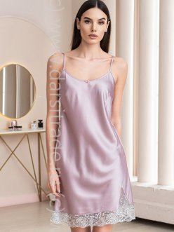 Короткая сорочка Mia-Amore на тонких бретелях без подреза под грудью, выполнена из принтованного смесового шелка. Изделие дополнено кружевными вставками по верху полочки и спинки. Декор - маленький атласный бантик с подвеской по центру выреза сорочки.