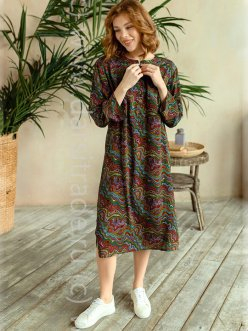 Длинная туника Миа-Миа прямого силуэта с круглым вырезом горловины на полочке и спинке из принтованной вискозы. Модель с втачными широкими рукавами. Круглый вырез горловины полочки и спинки обработан притачной фигурной обтачкой. V-образный разрез на горловине полочки обработан притачной планкой. Планка туники застегивается на петли и обтяжные пуговицы из основной ткани.