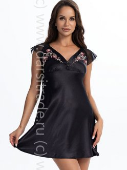 Короткая сорочка-платье Mia-Amore с подрезом, фигурным декольте в форме сердца и короткими рукавами из сетки. Лиф платья, декорированный традиционной европейской цветочной вышивкой, обработан тесьмой и застегивается на пуговицы.