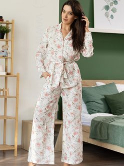 Классический комплект Mia-Amore состоит из жакета на пуговицах, с длинными рукавами и широких брюк, выполнен из принтованного хлопкового муслина. Борт, воротник и другие элементы жакета и боковые швы брюк декорированы кантом. В комплекте к жакету есть съемный пояс. Брюки на эластичном поясе с боковыми кармашками.