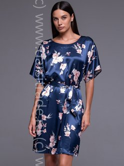 Туника Mia-Amore длинной до колен со спущенным коротким рукавом, круглым вырезом горловины выполнена из принтованного искусственного шёлка. В боковых швах карманы, рубашка комплектуется съемным поясом.