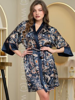 Короткий запашной халат-кимоно Mia-Amore с широкими длинными рукавами. Изделие выполнено из принтованного атласа с однотонной отделкой по бортам и низу рукавов, контрастный кант выступает границей между двух видов материалов. В боковых швах обработаны карманы. Изделие дополнено двухцветным поясом с кантом.