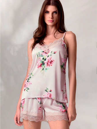 Пижама: топ на узких регулируемых бретелях и шорты. Выполнена из шелковистого сатина и элегантного кружева. Коллекция "Look".