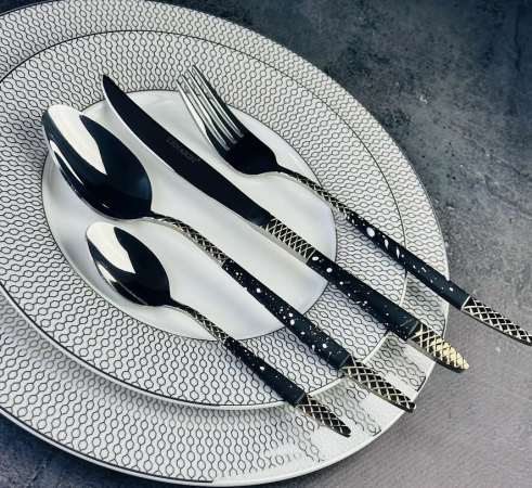 Столовые приборы изготовлены из высококачественной нержавеющей стали, устойчивы к ржавчине, прочны и долговечены, ручка покрыта декоративной эмалью