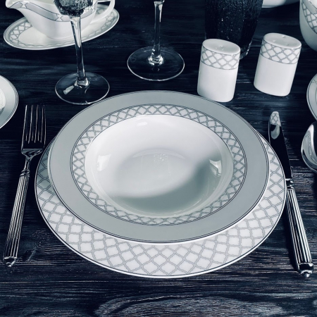 Изысканная коллекция ВЕРСАЛЬ изготовлена из полупрозрачного костяного фарфора. Изысканная палитра, сочетающая в себе нежные оттенки матового серого цвета и серебряного декора, очаровывает своей глубиной и игрой света. Изящный серебряный края, словно лунный свет, обрамляет тарелки. Утонченный рисунок из выполнен с искусной точностью. Коллекция состоит из предметов сервировка, обеденных, чайных и кофейных сервизов.
