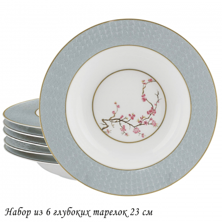 Коллекция САКУРА выполнена из воздушного костяного фарфора. Орнамент на бортах в рельефном исполнении, сочетает модный серый цвет с белой паутинкой. Нежная розовая ветка сакуры оттеняет рисунок борта, отводка золотом. Коллекция состоит предметов сервировки, чайных и кофейных сервизов