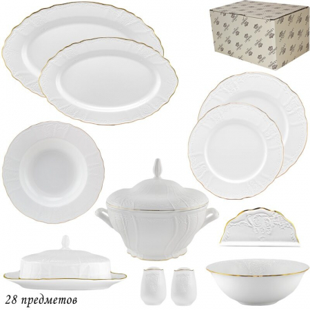 Коллекция Maria Gold выполнена в стиле барокко и производится из тонкого белого фарфора c золотой каймой. Изделия украшены рельефным декором, изящно подчеркивающими благородство фарфора, узорные края выглядят элегантно и всегда в тренде посудной моды.
