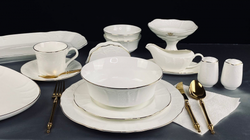 Коллекция Maria Gold выполнена в стиле барокко и производится из тонкого белого фарфора c золотой каймой. Изделия украшены рельефным декором, изящно подчеркивающими благородство фарфора, узорные края выглядят элегантно и всегда в тренде посудной моды.