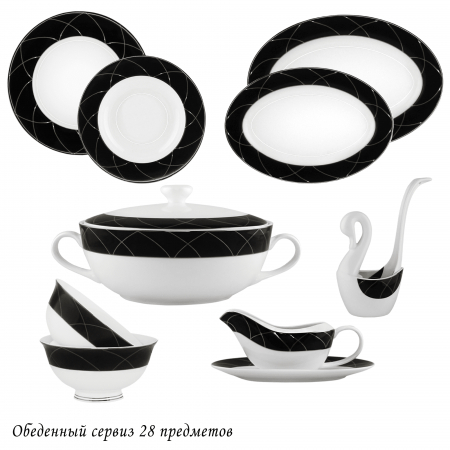 Коллекция PANDORA изготовлена из тонкого костяного фарфора белоснежного цвета. Бортик покрыт черной глазурью с тонкой серебряной сеткой и обводкой. Классическая линейка предметов сервировки: блюда, тарелки, салатники, сервизы и штучные предметы