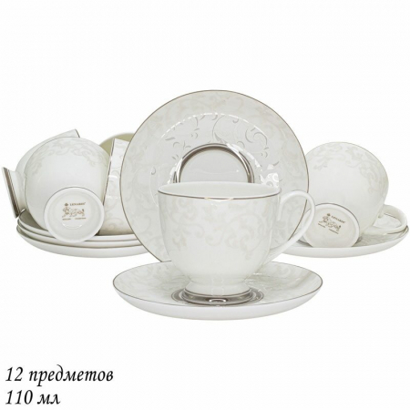 Коллекция СЕРЫЙ ШЕЛК изготовлена из легкого костяного фарфора. Декор выполнен в виде полупрозрачных с перламутровыми элементами цветах, часть элементов видна при определённом освещении. Серебряная окантовка подчеркивает нежность перламутровых элементов. Коллекция состоит предметов сервировки, чайных и кофейных сервизов