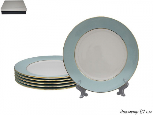 Набор из 6 тарелок 20,5 см, серия BLUE: высококачественный фарфор, золотая обводка, элегантный небесно голубой декор, изящные формы