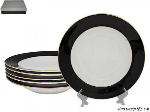 Набор из 6 глубоких тарелок 23см, серия BLACK: высококачественный фарфор, золотая обводка, элегантный черный декор, изящные формы
