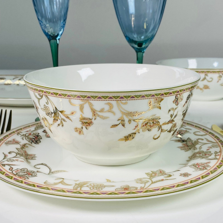 Столовый сервиз ЗОЛОТОЙ ЦВЕТОК изготовлен из костяного фарфора наивысшего качества, декорирован золотым рисунком, с добавлением контрастных красного и черных цветов. Декор красиво очерчен золотым напылением, классическая круглая форма предметов.