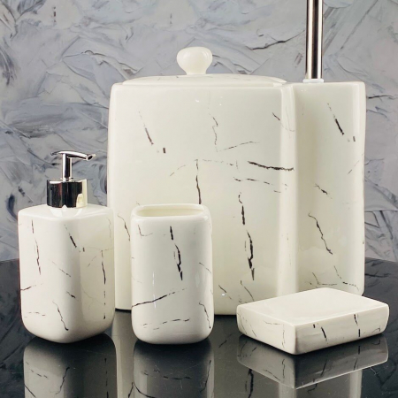 Набор аксессуаров для ванной комнаты состоит из пяти предметов: мыльница, дозатор для жидкого мыла, стакан зубных щеток, ершик для унитаза со стаканом, емкость для мелкого мусора. Набор выполнен из высококачественного фарфора с мраморным рисунком и серебристыми элементами