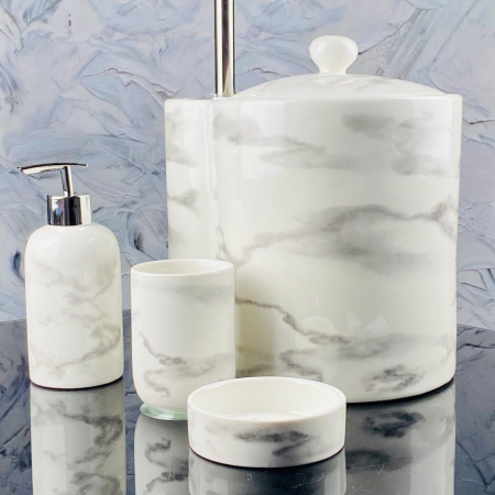Набор аксессуаров для ванной комнаты состоит из пяти предметов: мыльница, дозатор для жидкого мыла, стакан зубных щеток, ершик для унитаза со стаканом, емкость для мелкого мусора. Набор выполнен из высококачественного фарфора с мраморным рисунком и серебристыми элементами