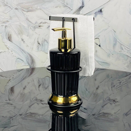 Диспенсер выполнен из фарфора с рефленной поверхностью и черной глянцевой эмалью. Дозатор выполнен из АВС пластика в золотом цвете