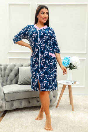 Халат женский на серебристой молнии выполнен из набивного велюра. Халат с рукавом 3/4, головина и карманы отделаны тканью контрастного цвета. Халат идеально подойдет для дома и отдыха.
