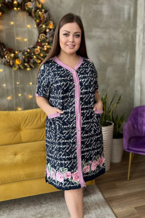 Халат женский прямого силуэта. Рукав цельнокроенный корокий. На полочке два накладных кармана. В боковых швах разрезы. Край борта, низ рукава, верх кармана обработаны широкой окантовкой. По низу халата купон розы, так же этот принт возможен на рукаве. На модели 52 размер