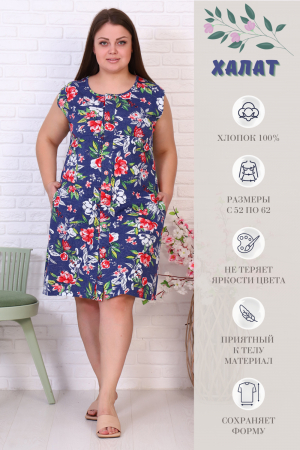 Халат женский на пуговицах, c накладными карманами. Изготовлен из натурального хлопка. Комфортная длина изделия, свободный покрой обеспечит вам удобство и не стеснит ваших движений. На спинке халата есть 2 полупояса, которые регулируют объем в талии. Нежная расцветка создаст милый и нежный образ. В такой модели будет удобно женщине любого возраста.