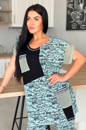 Туника женская прямого силуэта. Горловина круглая, рукав цельнокроенный короткий. Карманы на полочке, манжеты на рукаве из оливковой сетки, которая гармонично сочетается с набивной вискозой. Декоративная тесьма для хлястов рукава и отделки карманов придает тунике наибольшую актуальность.