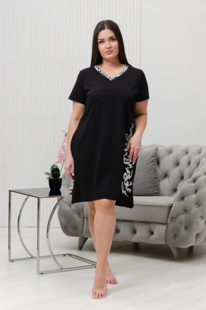 Туника полуприлегающего силуэта, с боковыми карманами, средней длины, с V-образной горловиной. Рукав втачной, короткий. На полочке расположена кокетка. В нижней части боковых швов обработаны разрезы. Горловина обработана обтачкой из отделочного полотна.