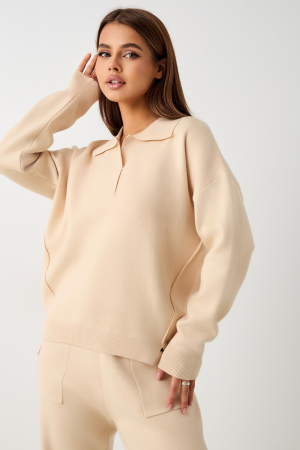 Вязаный костюм станет незаменимой основой женского гардероба для прохладной погоды, комфортным способом утепления. Он сшит из мягкой, приятной к телу пряжи с шерстяными волокнами, которая надолго сохраняет насыщенность цвета и свою форму, выдерживая интенсивное ношение и частые стирки. Стильный дизайнерский комплект отличается продуманным дизайном: кофточка - оверсайз со спущенным плечом, V-образным вырезом горловины и отложным воротником обеспечивает комфорт, а брюки - спортивки с широким поясом - резинкой, длинными штанинами с манжетами и удобными карманами подчеркивают силуэт, не сковывая движений. Универсальность классической пастельной палитры и лаконичного дизайна позволяет легко включать комплект в коллекцию вещей для осенне - весеннего демисезонного и зимнего периода. Он идеально сочетается с однотонными вариантами обуви и нарядными праздничными аксессуарами для создания элегантного и собранного образа.