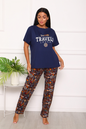 Костюм женский состоит из футболки и брюк. Костюм выполнен из трикотажного полотна кулирка. Кофта свободного силуэта на полочке выполнена печать. Брюки-чиносы слегка заужены к низу, по бокам имеются карманы, пояс на резинке.