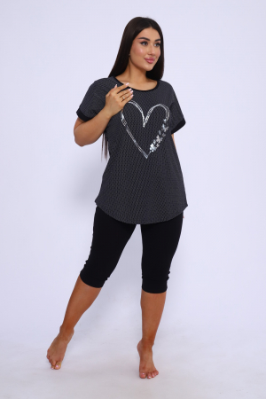 Костюм включает в себя стильную футболку и бриджи, выполненные из высококачественного материала, который гарантирует отличную воздухопроницаемость и приятные тактильные ощущения. Будьте уверены, что в этом комплекте вам будет удобно и тепло в любое время года. Он отлично сидит на фигуре и подчеркивает её достоинства, что особенно актуально для подходящей одежды больших размеров. Пижама с бриджами обеспечивает свободу движений, позволяя вам заниматься йогой, фитнесом или просто расслабляться на диване. Спортивный стиль костюма в сочетании с модными элементами поможет вам выглядеть стильно и современно даже в домашней обстановке. Футболка имеет удобный крой и не стесняет движений, что делает её отличным выбором для активного отдыха.