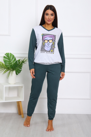 Костюм женский выполнен из меланжированной кулирки. Кофта с длинным рукавом снизу на резинки, на полочке выполнена печать. Брюки свободного силиэта, по бокам карманы, низ брюк на резинке