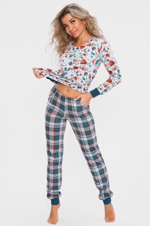 Домашний костюм с НОВОГОДНИМ принтом, состоит из футболки с длинным рукавом (длина рукава указана от горловины) и брюк с карманами в боковых швах, все манжеты на костюме выполнены из плотной резинки - кашкорсе. Стильный домашний комплект двойка имеет натуральный состав 100% хлопок, удобная и практичная одежда для дома .