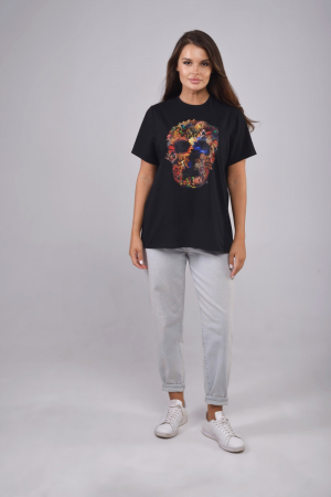 Футболка женская, повседневная, нарядная, спортивная, большие размеры, свободный крой, удлиненная, круглая горловина, стильная, черного цвета из трикотажного хлопок с эластаном, 170 г/м2 с прикольным принтом. Принт трансфер принт - технологией нанесения картинки на изделие с использованием высоких температур. Стилизованный принт черепа - стильное сочетание модного и дерзкого дизайна добавляет выразительности и разнообразию ежедневному стилю одежды.