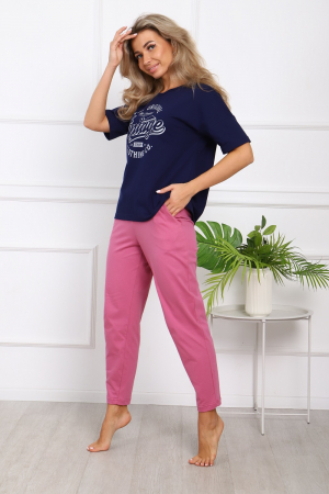 Пижама женская: футболка с короткими рукавами с принтом на полочке, брюки разных расцветок с боковыми карманами.