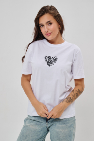 Женская футболка элегантного приталенного кроя с короткими рукавами и классическим круглым вырезом горловины. Минималистичный дизайн дополнен нежным принтом в форме сердца с узором зебры, создающими тонкий акцент на образ. Материал приятен к телу, обеспечивает комфорт и свободу движений. Идеально подойдет для повседневного стиля, подчеркивая женственность и утонченность облика обладательницы.