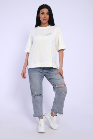 Футболка женская с мерцающим принтом из плотной, высокого качества кулирки с лайкрой пенье. Модель свободного силуэта, короткий рукав с широким манжетом, низ футболки обработан широкой планкой , по бокам небольшие разрезы. Стильная, удобная футболка для девушек разного возраста и фигуры, скроет недостатки и подчеркнёт достоинства.