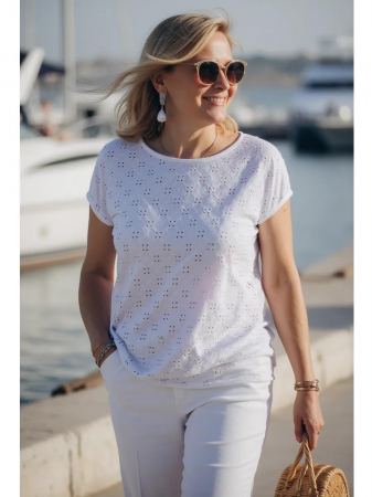 Летняя женская футболка с коротким рукавом от DiColore станет отличным дополнением к вашему гардеробу. Выполненная из легкой и дышащей вискозы, она прекрасно подходит для летнего сезона. Ажурная ткань с перфорацией обеспечивает отличную вентиляцию, что делает её идеальным выбором для жарких дней. Белый цвет придаёт свежесть вашему образу, а спущенное плечо добавляет нотку стильности и расслабленности. Белая ажурная блузка создает легкий и воздушный образ, свободная посадка не стесняет движений. Удобная базовая модель позволяет сочетать ее с джемпером, пиджаком или другими верхними слоями. Футболка универсальна: её можно носить как в офисе, так и на каждый день. Праздничный вариант также возможен достаточно дополнить её аксессуарами. Эта блузка подойдет для любого типа фигуры и станет отличным выбором для создания разнообразных образов, позволяя вам оставаться модной и уверенной в себе.
