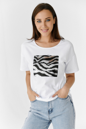 Футболка прямого силуэта, с округлой горловиной спереди и V-образной на спинке, с удлиненной спинкой. Рукав короткий. В верхней части спинки обработан фигурный вырез со шнуром. Горловина обработана бейкой из основного полотна. На полочке эффектная аппликация из пайеток
