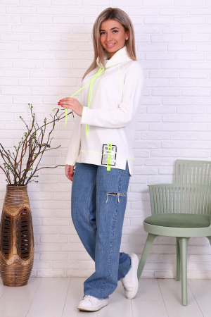 Интересный лонгслив с декоративным элементом, находящимся в левом нижнем углу изделия. Расположенный сверху хомут очень гармонично подходит под модель, а неоновый шнур дополняет нитки и декор. Снизу изделия по бокам находятся разрезы. Лонгслив выполнен из футера 2-х нитки: 73% хлопка, 22% полиэстер, 5% лайкра, плотностью 220 гр.