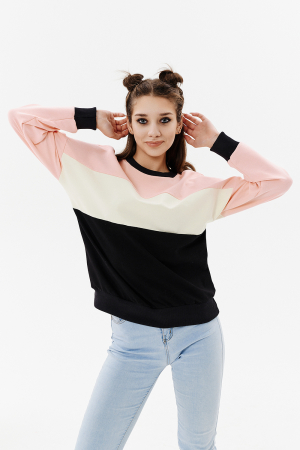 Толстовка свободная, на эластичном поясе, с длинным рукавом на эластичном манжете. Полочка и спинка состоят из горизонтальных частей из отделочных полотен. Горловины обработана обтачкой из эластичного полотна.