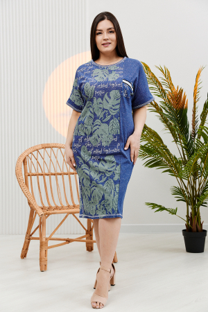 Платье женское полуприлегающего силуэта, рукав цельнокроенный короткий. Полочка состоит из трех частей. Левая боковая часть из контрастной отделочной ткани, сверху расположен нагрудный карман с настроченной на него тесьмой. С правой стороны полочки в горизонтальном шве внутренний карман. Круглый вырез горловины и манжеты рукава окантованы бейкой из отделочной ткани и белым кантом.