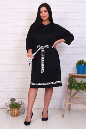 Платье женское прямого кроя. Горловина отделана кантом. Спущенный рукав на манжете. Фигурные накладные карманы. Через шлевки продет пояс из декоративной ленты. По низу изделия настрочена лента. Сбоку небольшой разрез.