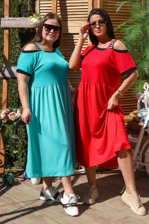 Фасон платья позволяет легко скрыть недостатки фигуры и при этом элегантно выглядеть! Платье отрезное выше линии талии, длиной ниже колена. Рукав цельнокроеный, короткий, с манжетом из отделочного полотна. Верхняя часть платья выполнена из эластичного полотна, юбка со сборкой по линии талии. Горловина асимметричная, с эластичной бретелью, обработана обтачкой из отделочного полотна.