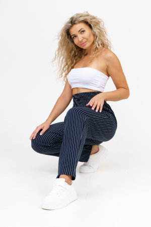 Нравятся полосатые брюки, но не можете определиться, с чем их носить? Мы вас понимаем. Это не самые простые для составления образов брюки, но выглядят они великолепно, и, конечно же, никогда не выйдут из моды. Поэтому в них просто невозможно не влюбиться. Для образа на каждый день к брюкам в полоску подбирайте рубашки свободного кроя, топы, модные кашемировые свитера или водолазки. Вы можете надеть как однотонный верх, так и поэкспериментировать с принтами. В идеале, цвет рисунка должен сочетаться с одним из оттенков штанов. Вы точно не ошибетесь, если принт будет минималистичным, например, надпись или логотип бренда. В качестве обуви подойдут кроссовки на массивной подошве, лодочки на каблуке или лоферы. В тандем с полосатыми штанами идеально впишется стильный жакет, блейзер или вязаный кардиган. На прохладную погоду к брюкам в полоску подойдет пальто, кожаная или джинсовая куртка и соответствующая обувь: ботильоны, казаки, ботинки челси. И вы также можете комбинировать полосатые брюки с однотонными рубашками и пиджаками, лонгсливом и кардиганом. Завершите аутфит лодочками, лоферами или оксфордами. Данная модель будет радовать Вас своим комфортом и практичностью каждый день. Так что не сомневайтесь, брюки в полоску это модный хит сезона!
