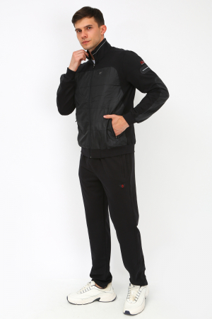 Спортивный мужской костюм. Кофта на молнии, спереди и на рукавах декоративная вставка из плащевки, сбоку вышивка с надписью. Воротник - стойка, низ кофты и рукава на резинке. Брюки прямого кроя, карманы на молнии. Турецкая ткань.