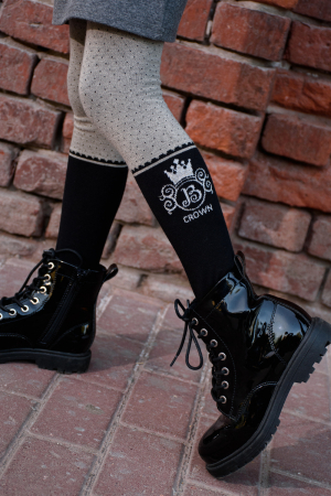 Стильные подростковые колготки с переливающейся эмблемой из нитей люрекса. Однотонная основа в горошек, снизу имитация черного носка с ажурным краем. Отлично подойдут для школы.