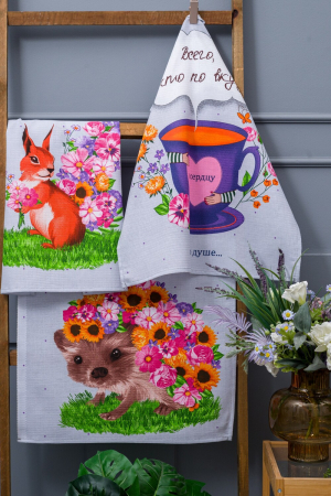 Этот набор кухонных полотенец Цветочное настроение - идеальное дополнение к вашей кухне. В наборе представлены 3 полотенца серого цвета с яркими цветами. Два полотенца украшены милыми изображениями белки и ежика, которые придадут вашей кухне уют и тепло.